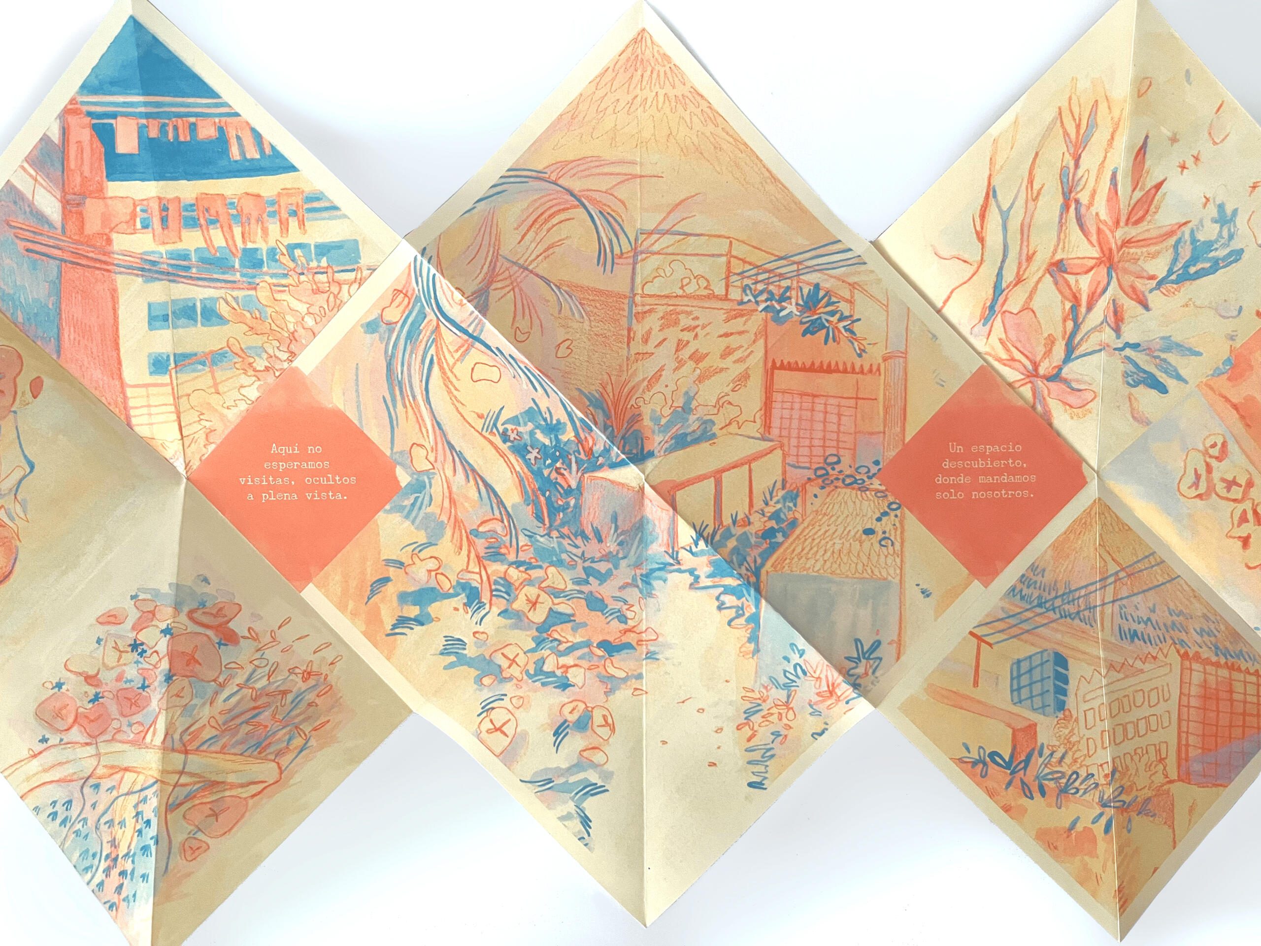 Fanzine formato dragón, reflexión sobre los espacios y los escondites personales. Técnica mix media, editado digital. (2024)