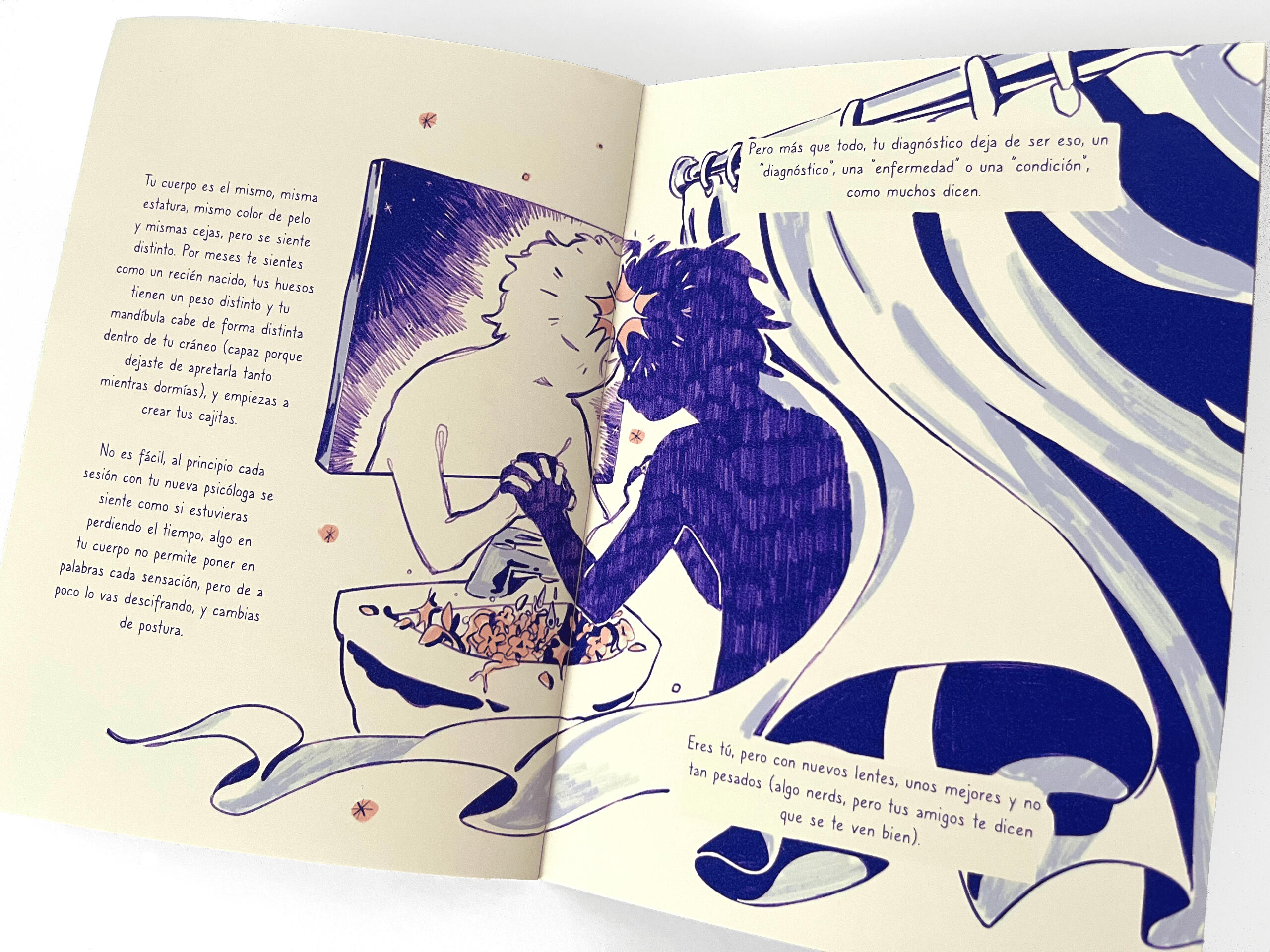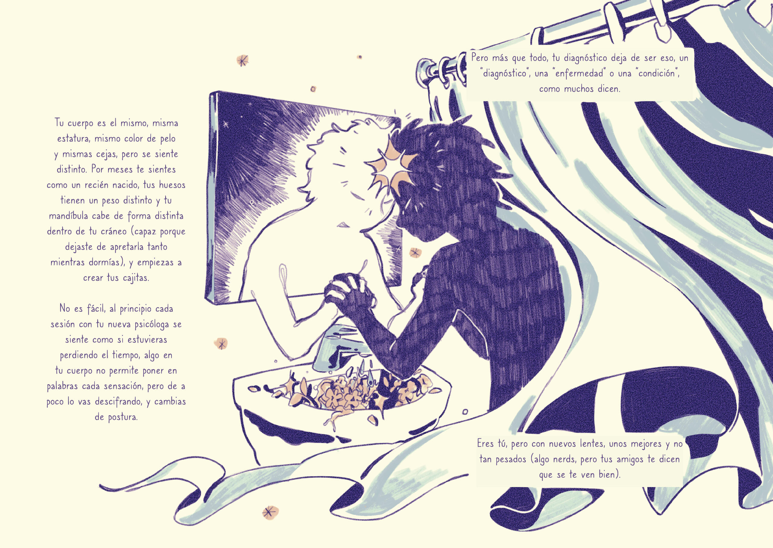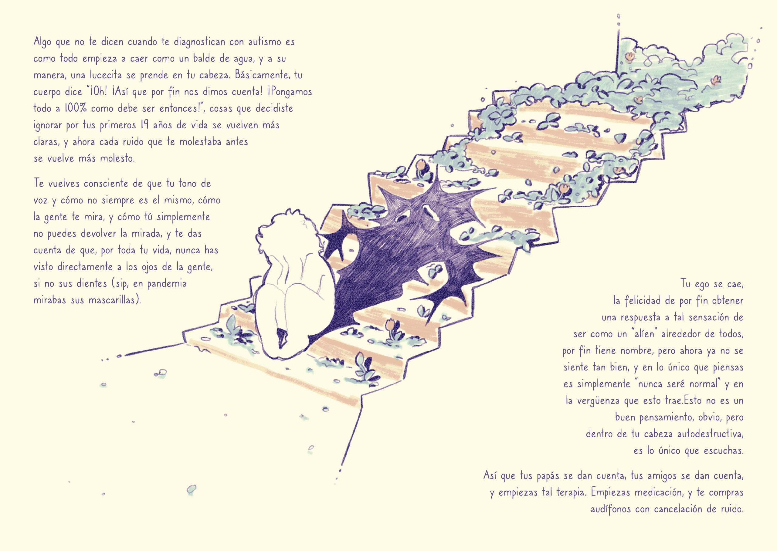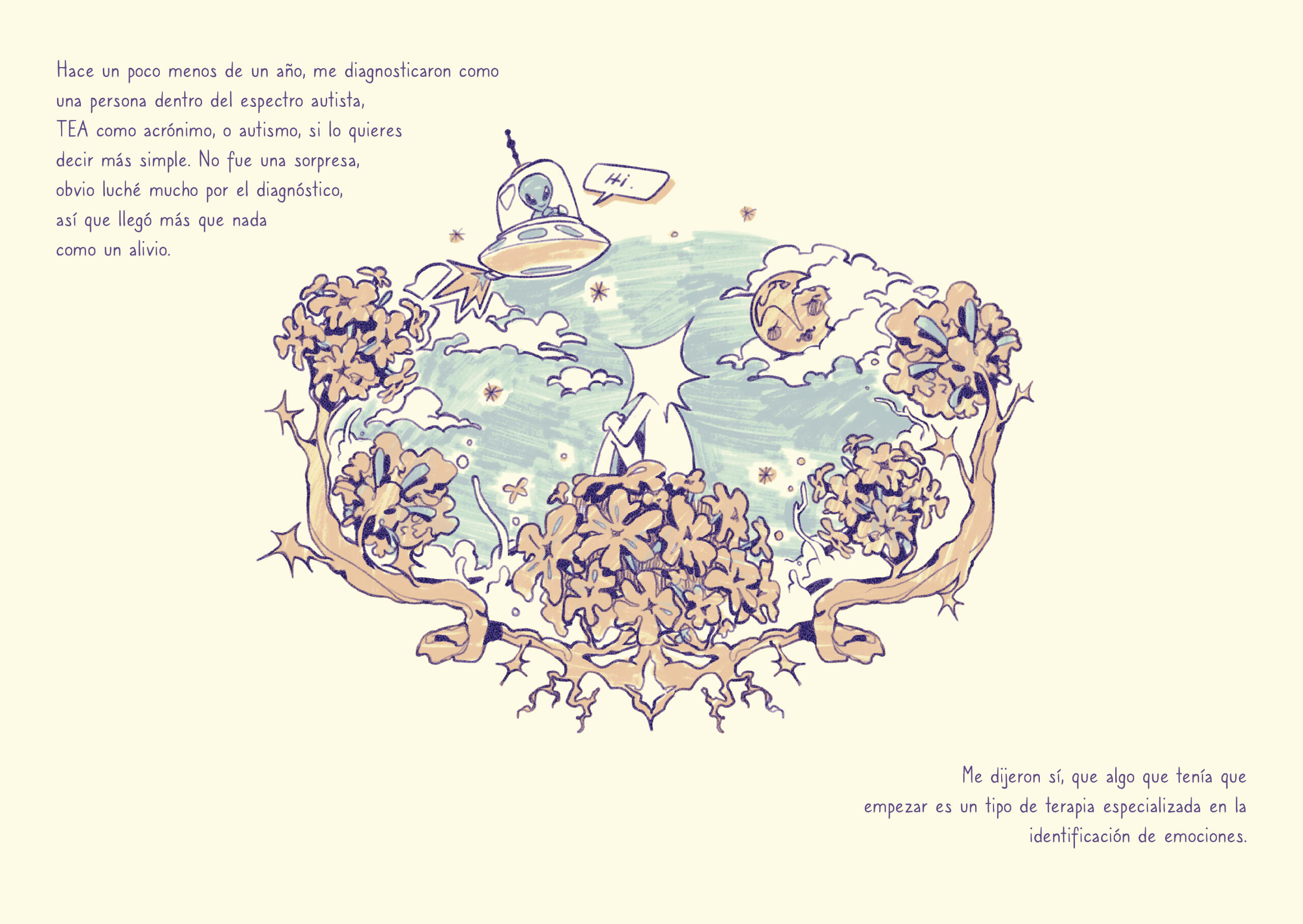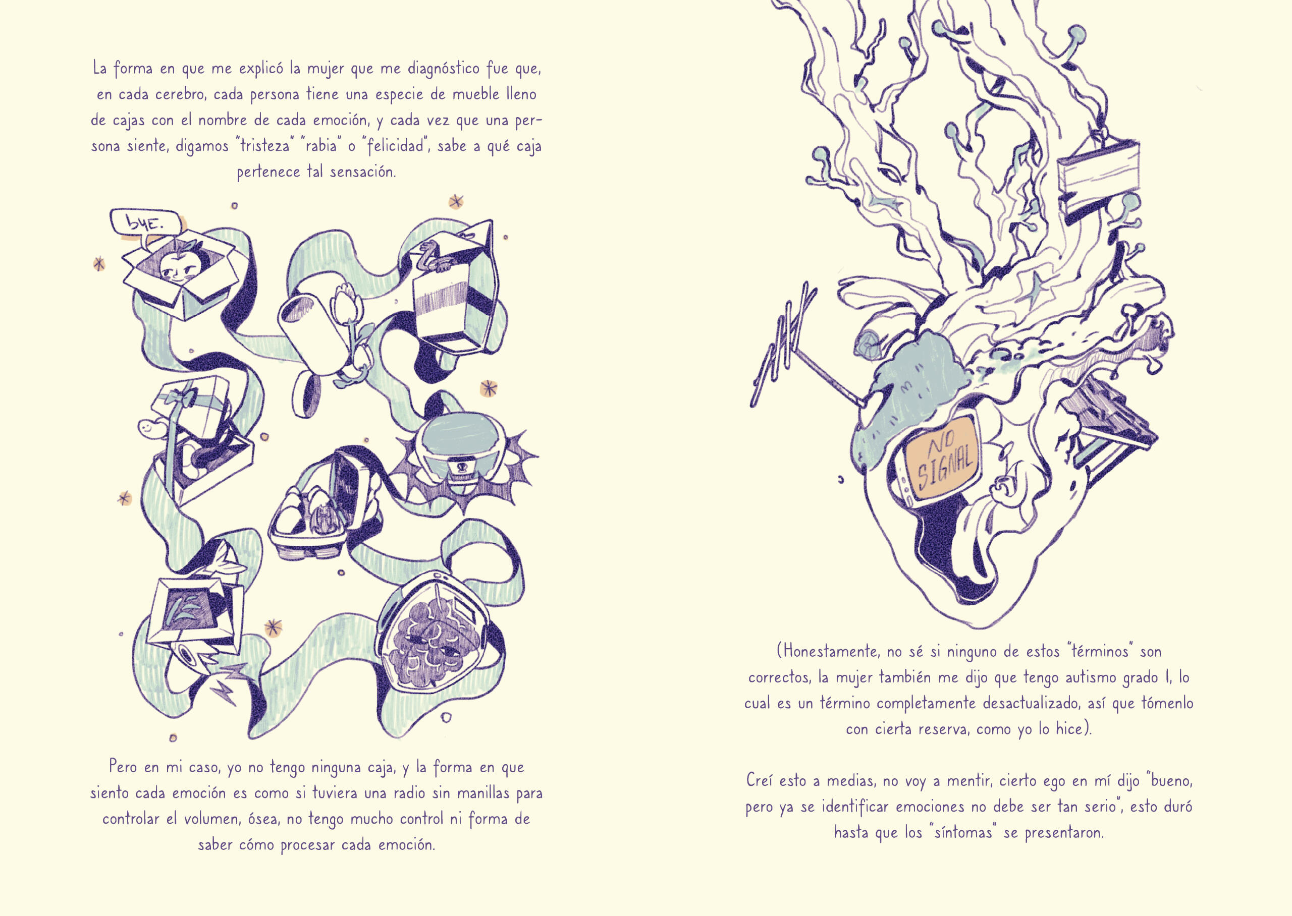 Libro álbum corto, un relato/diario personal sobre la experiencia neurodivergente de ser diagnosticado a una edad tardía.