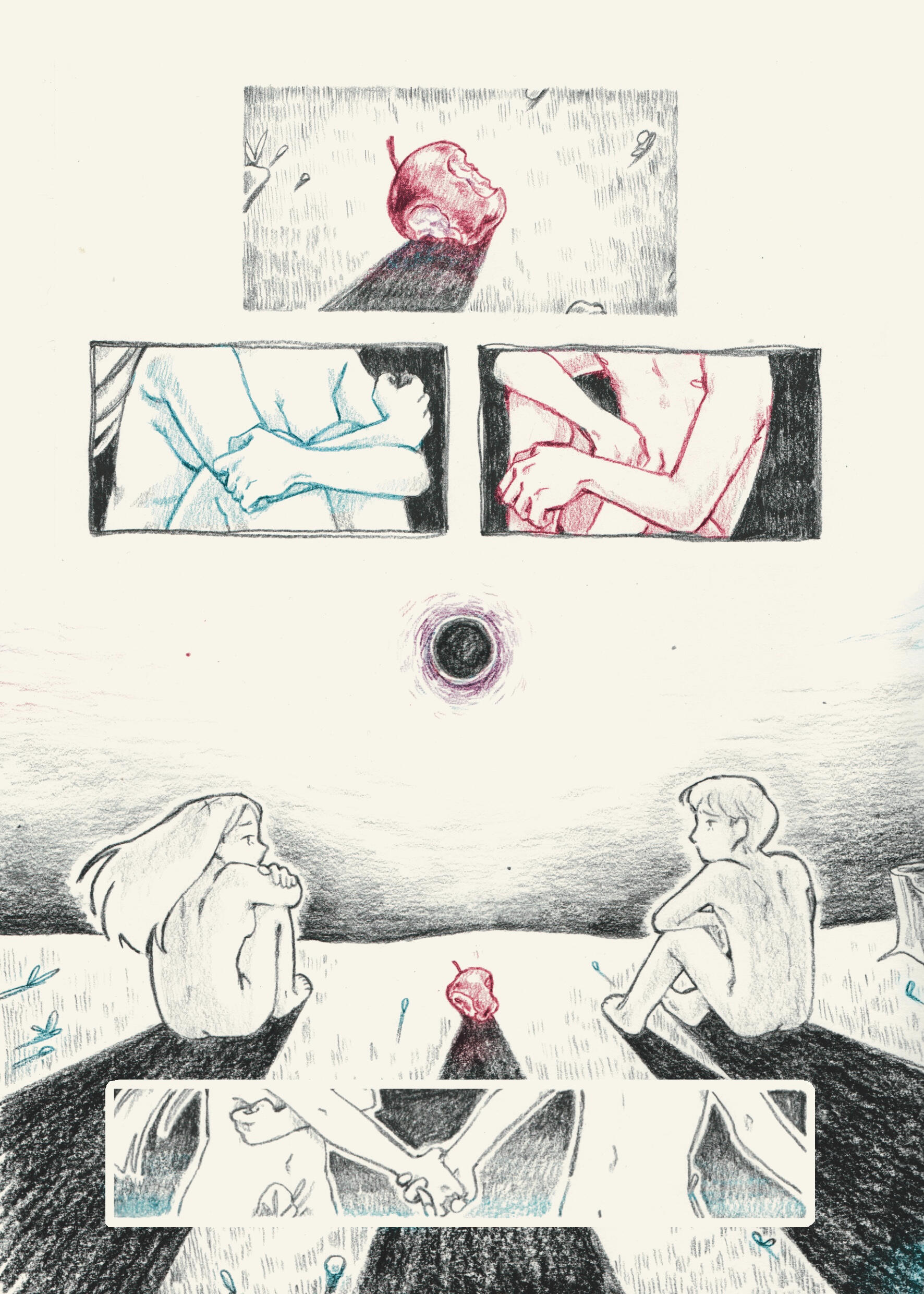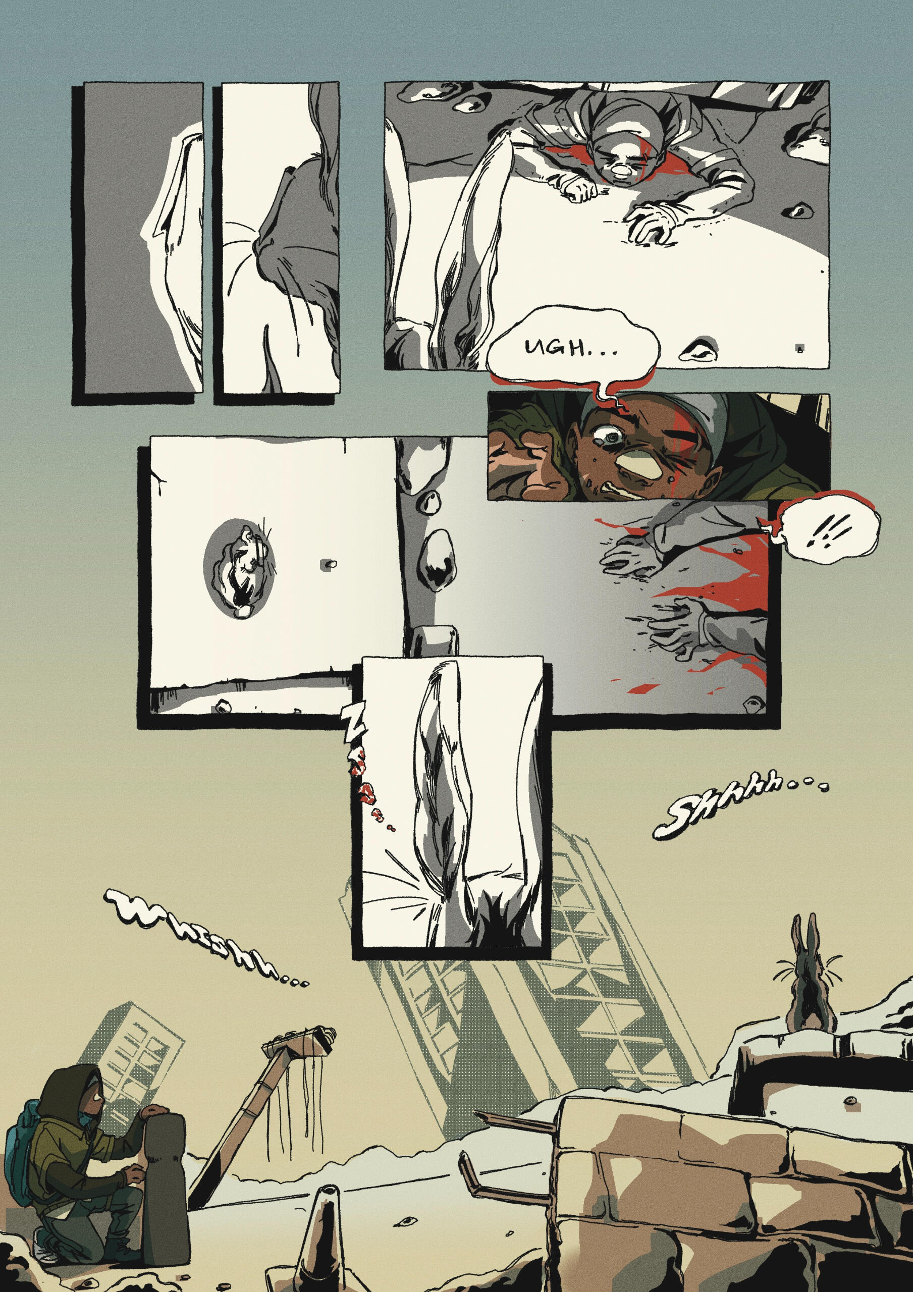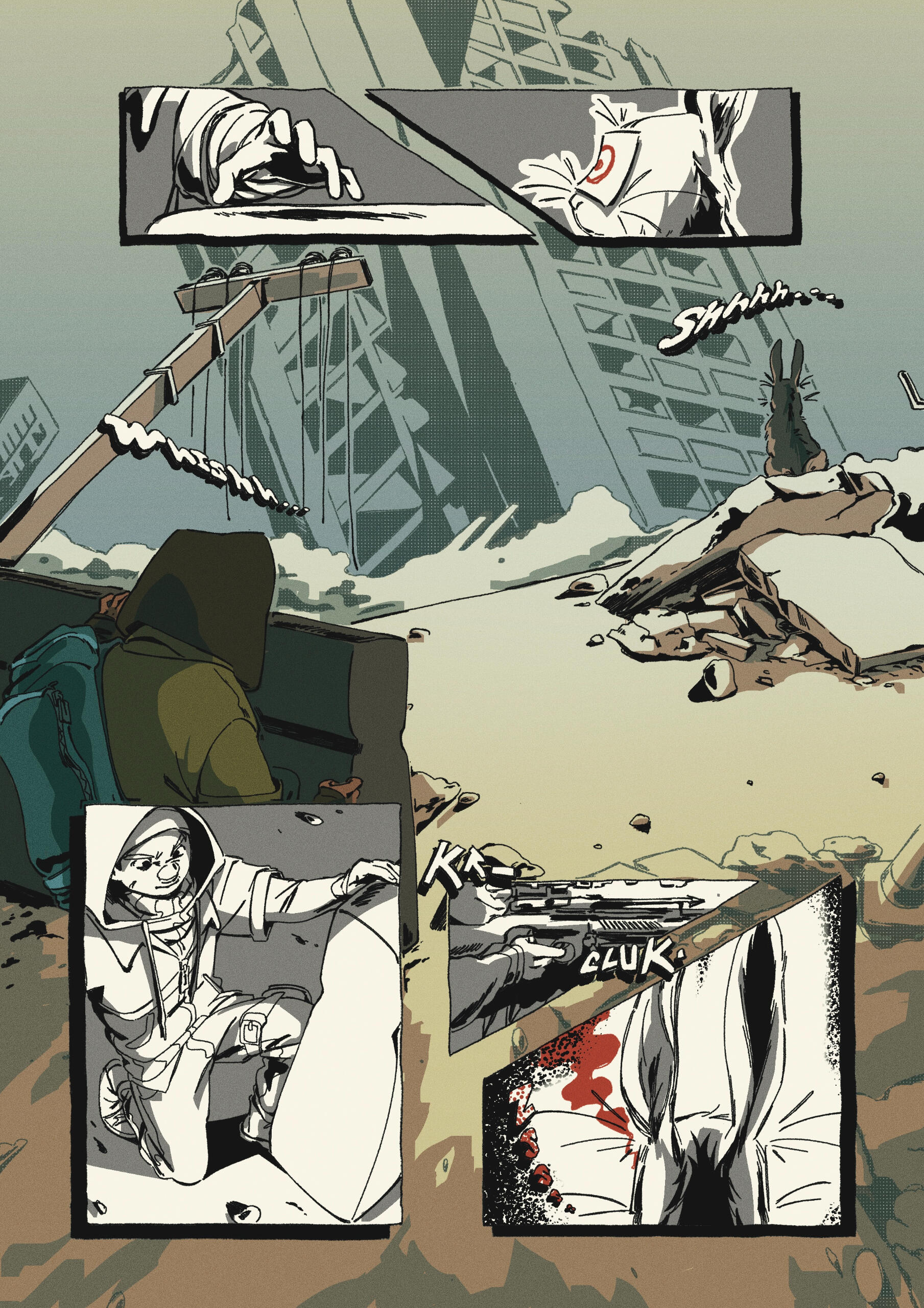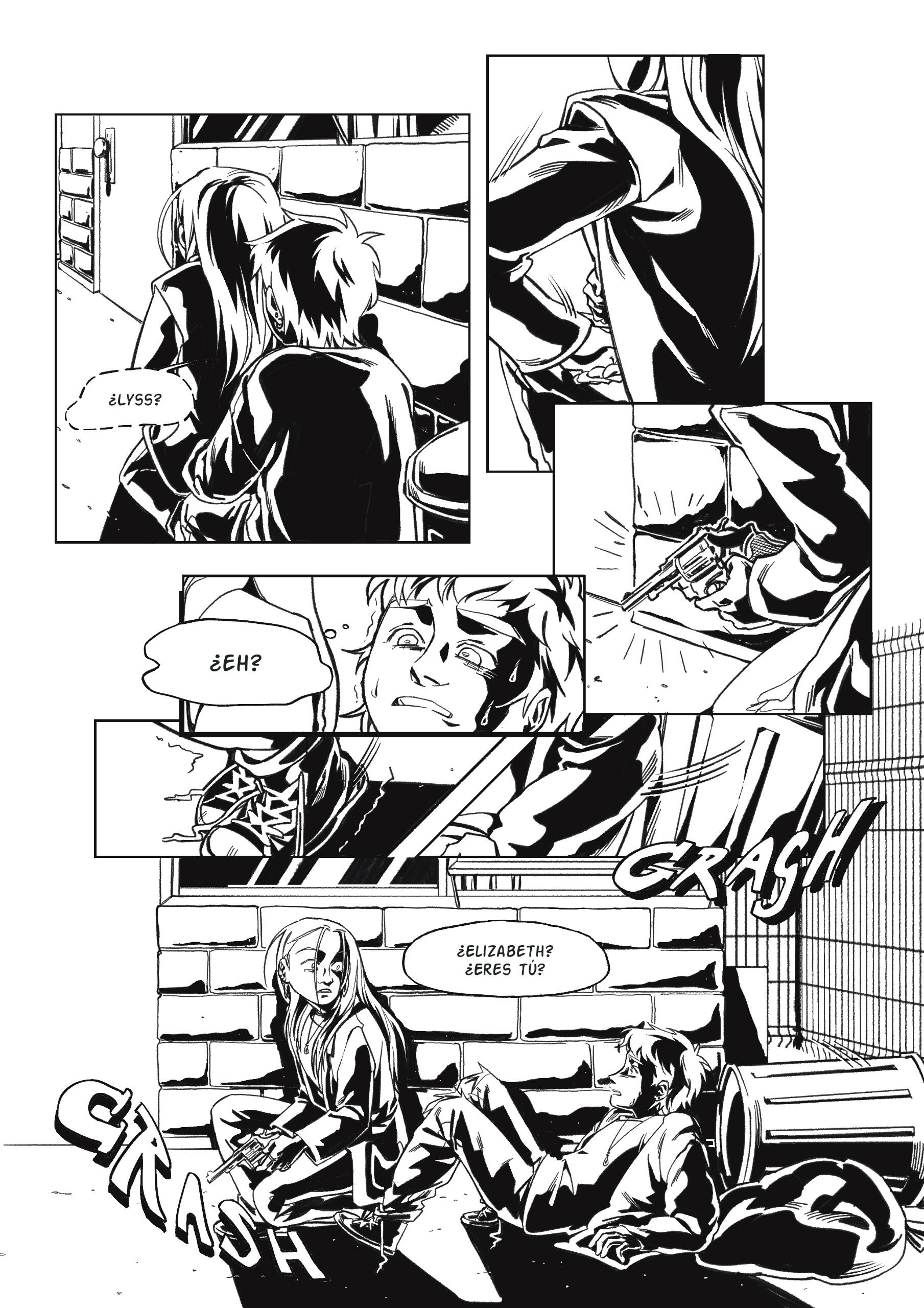 Cómic experimental de 5 páginas, con temática de distopia, un relato autoconclusivo, que utiliza la técnica narrativa “in extrema res” (comenzar una historia por el final). Trabajo digital. (2024)