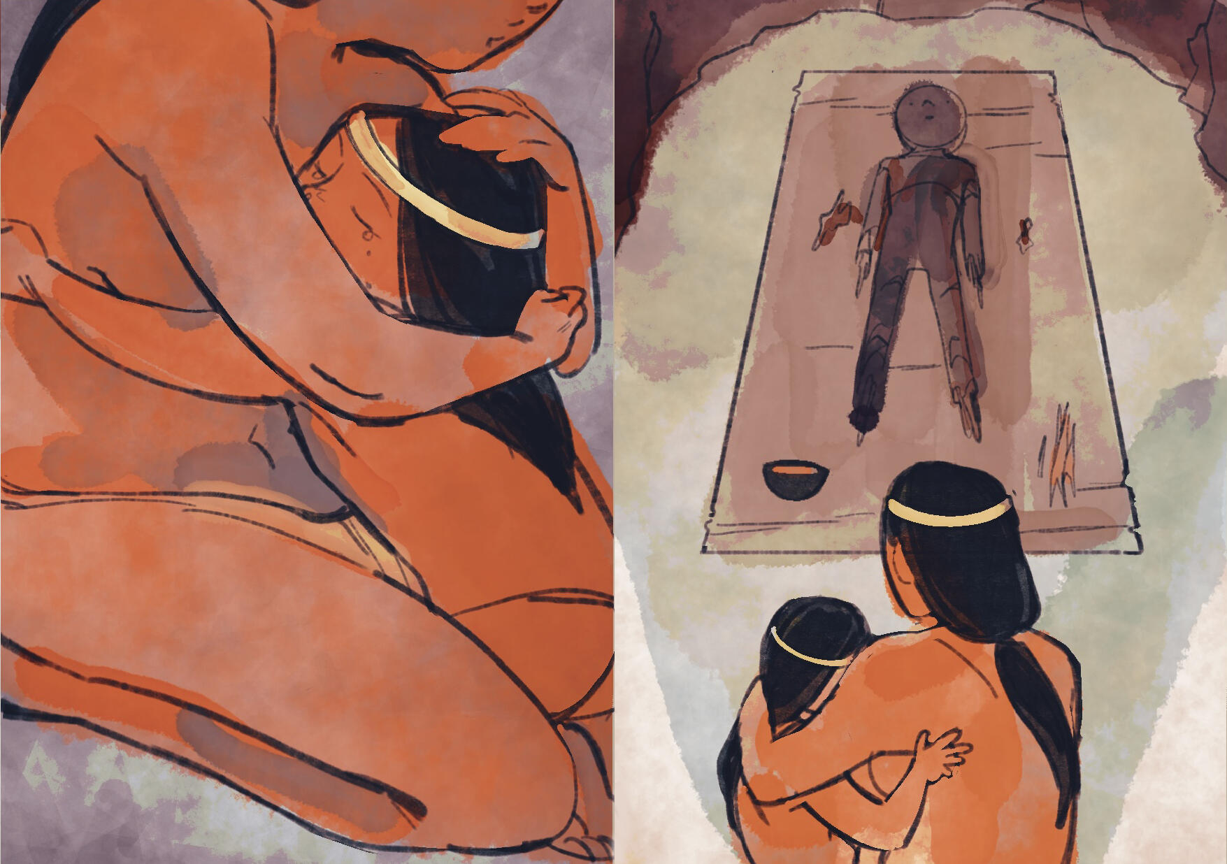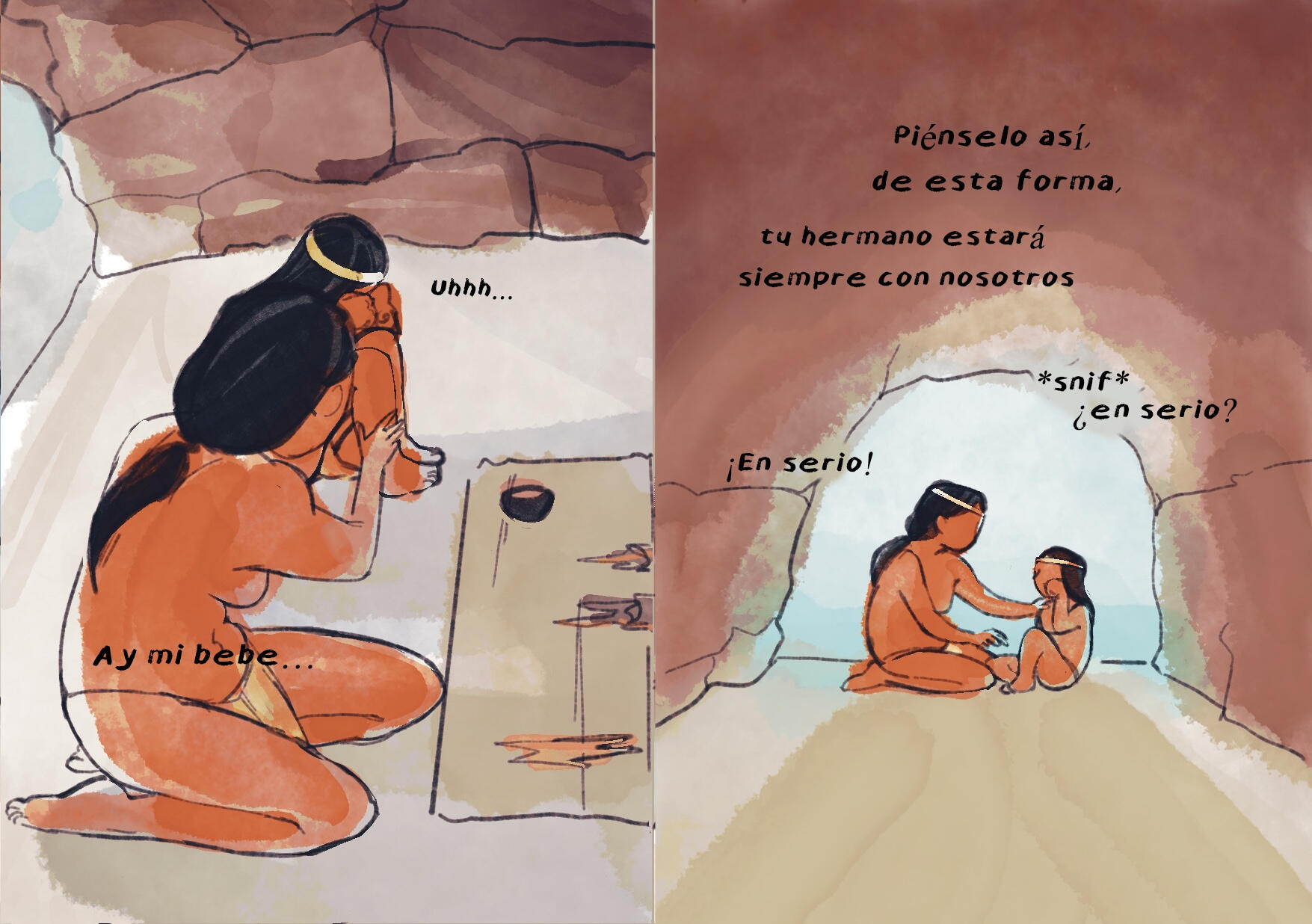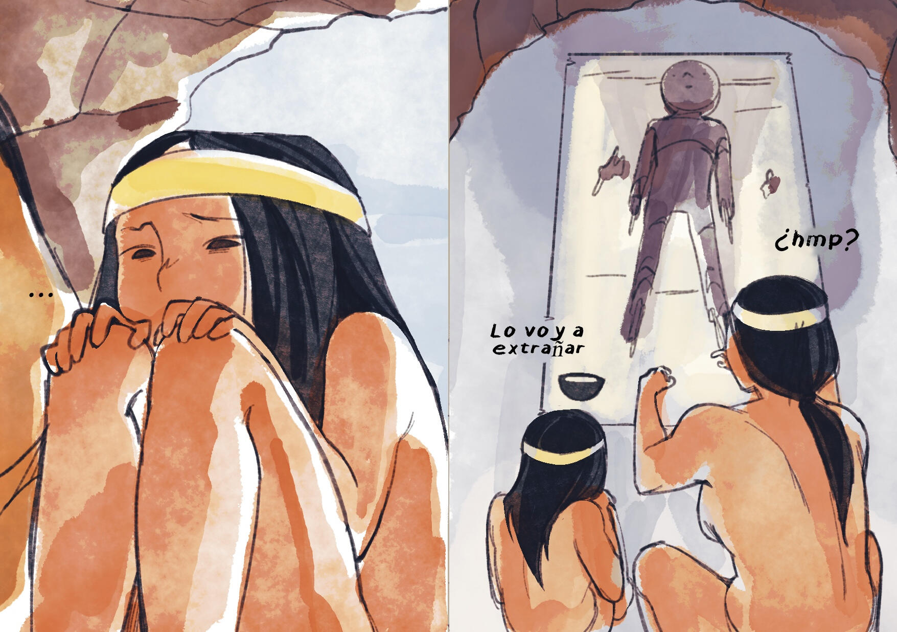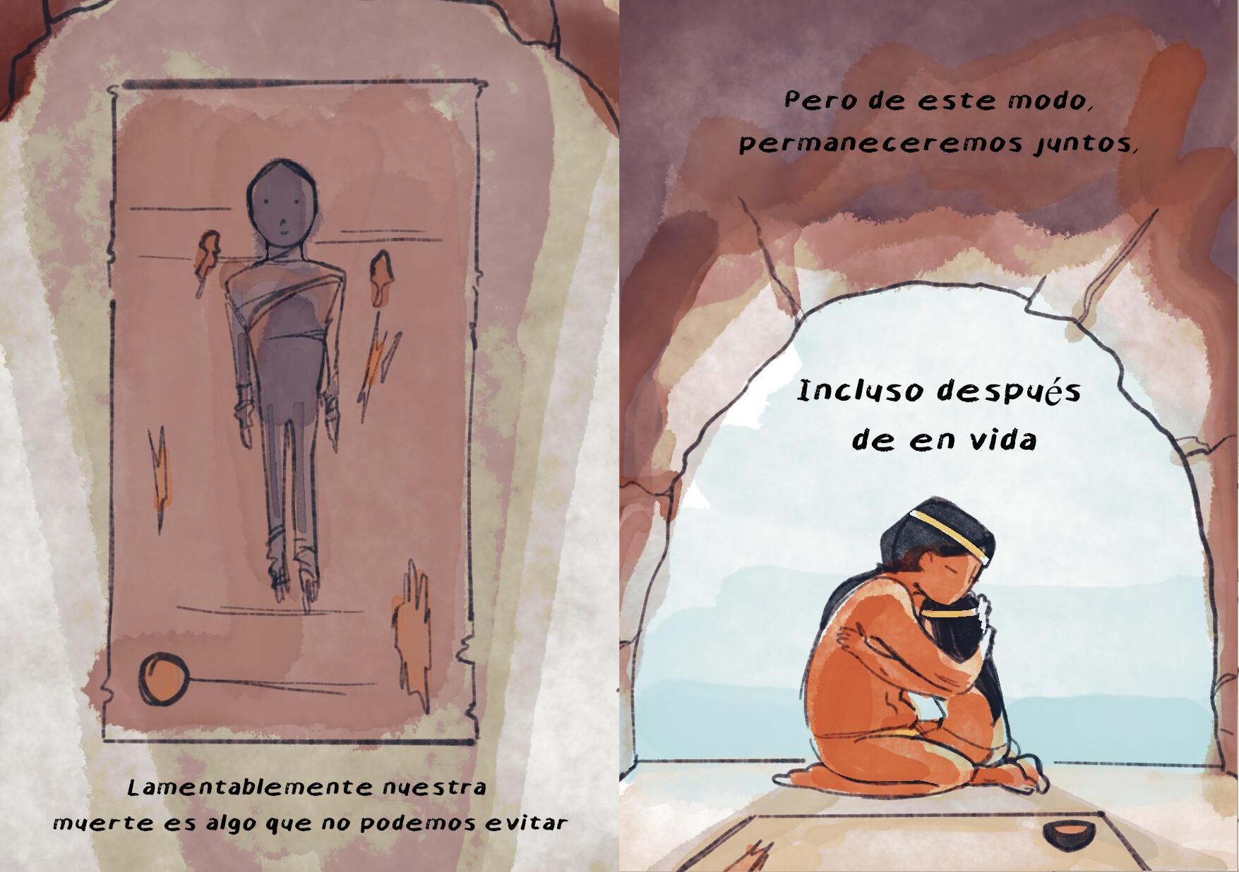 Fanzine en formato revista, relato ficticio que retrata la cultura chinchorro y su proceso funerario, la momificación. Trabajo digital. (2022)