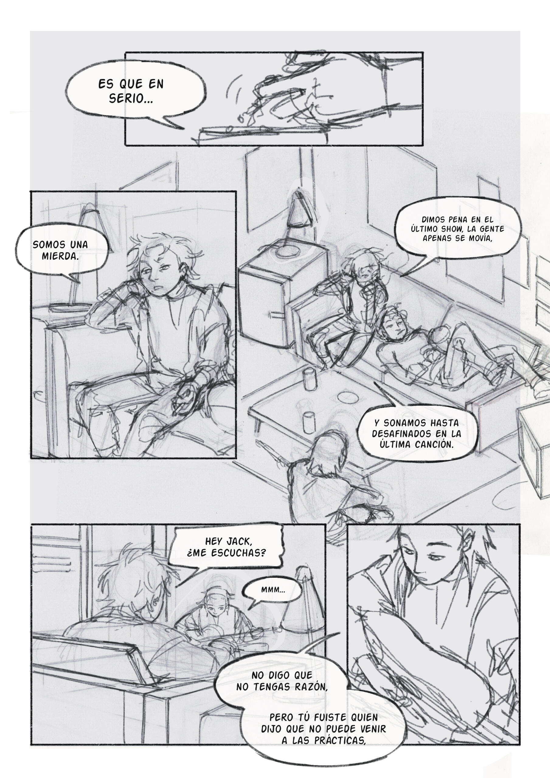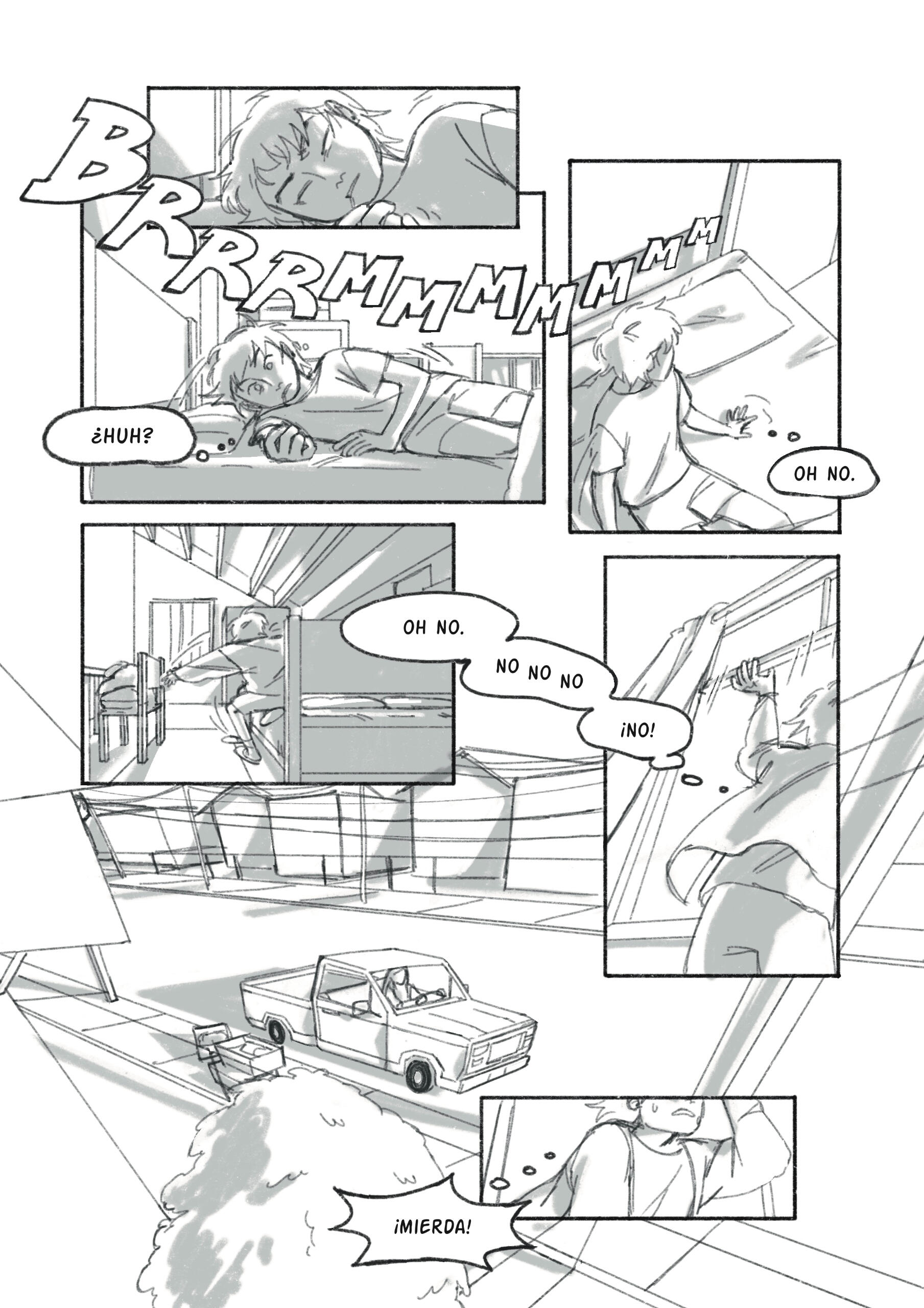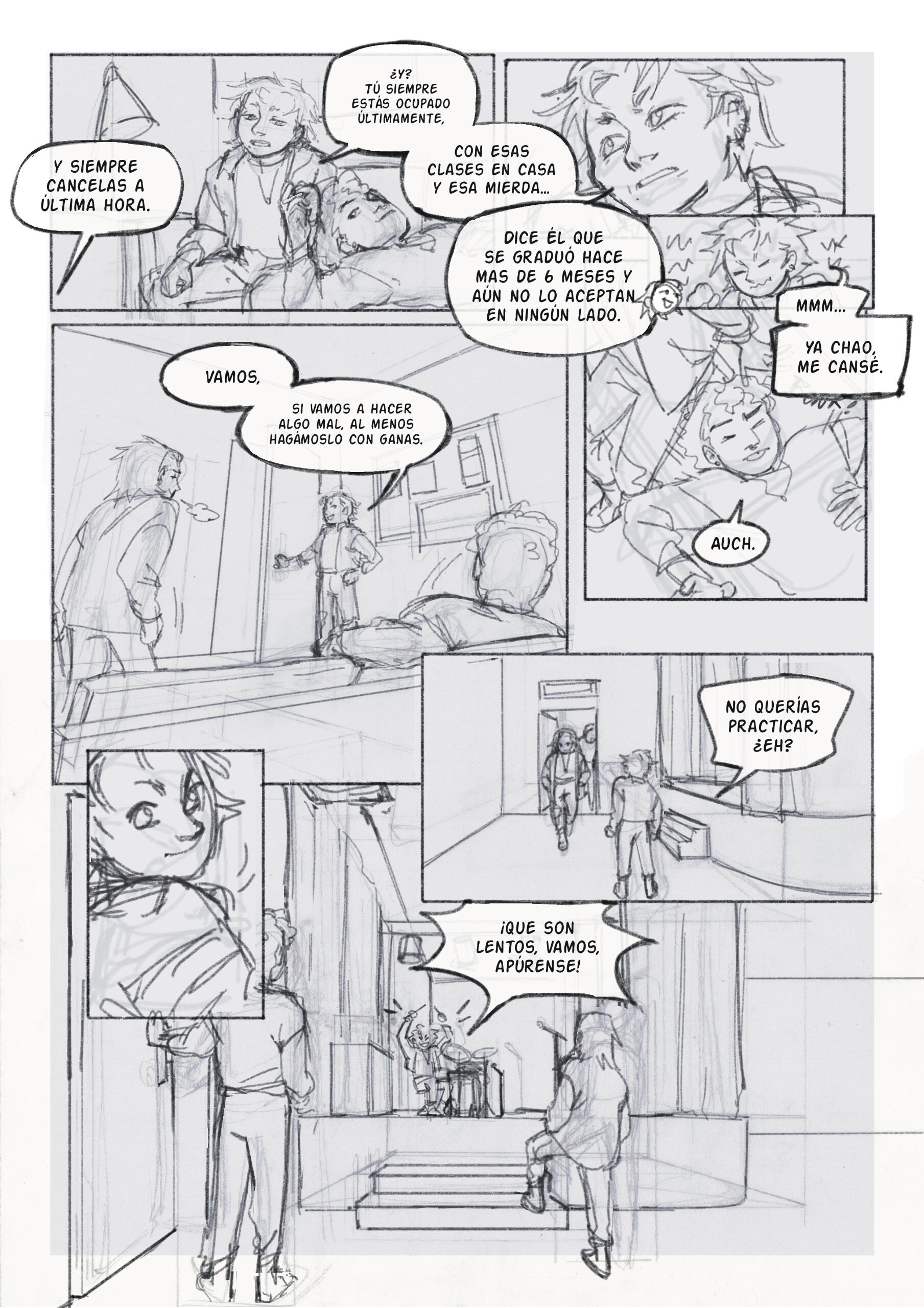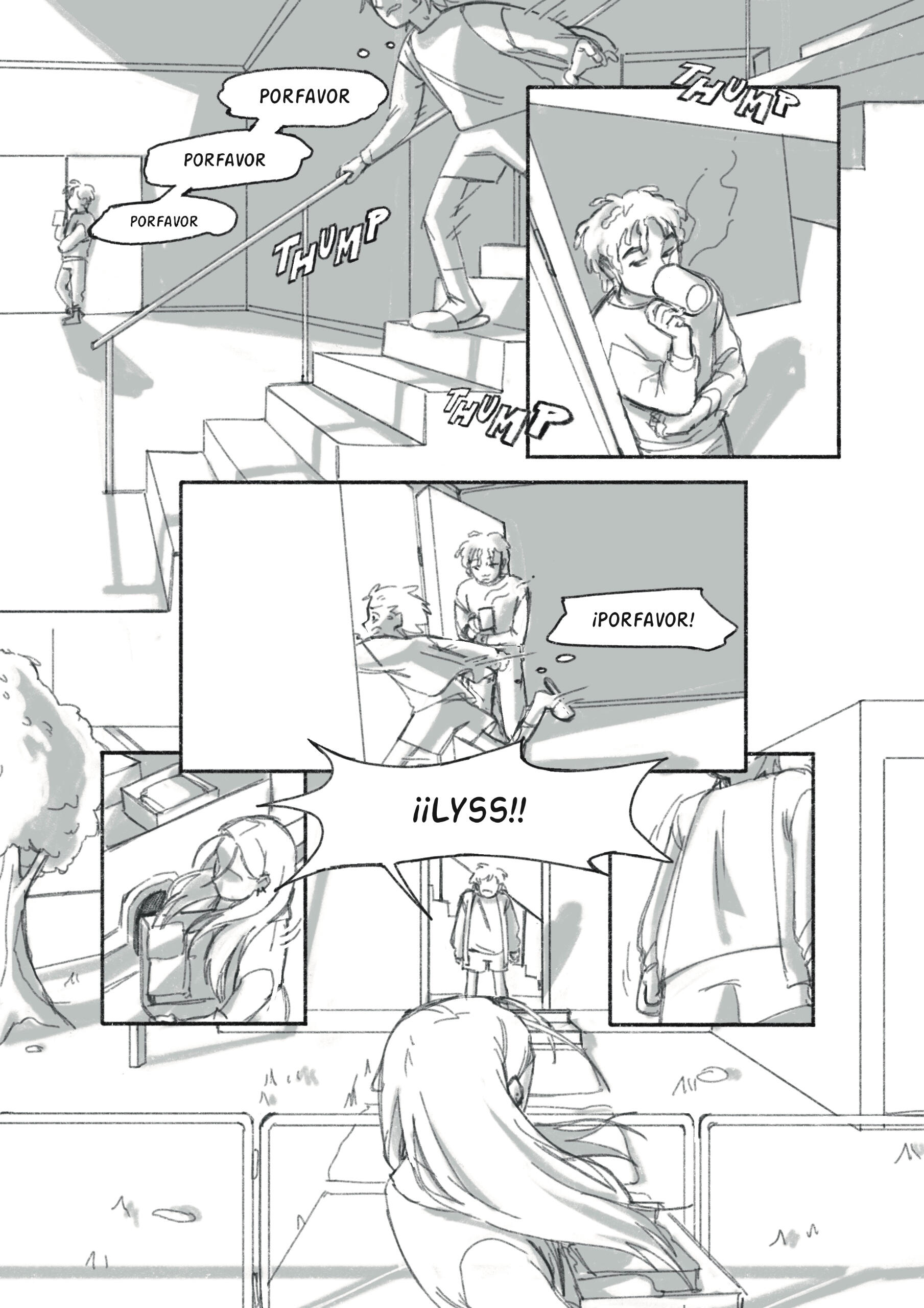 Segunda fase del boceto: cómic de 2 páginas, con un enfoque en encuadre de cámara y montaje de viñetas. Boceto digital. Primera fase del boceto, cómic de 2 páginas, con un enfoque en fondos y perspectiva. Boceto análogo y editado digitalmente. (2024)