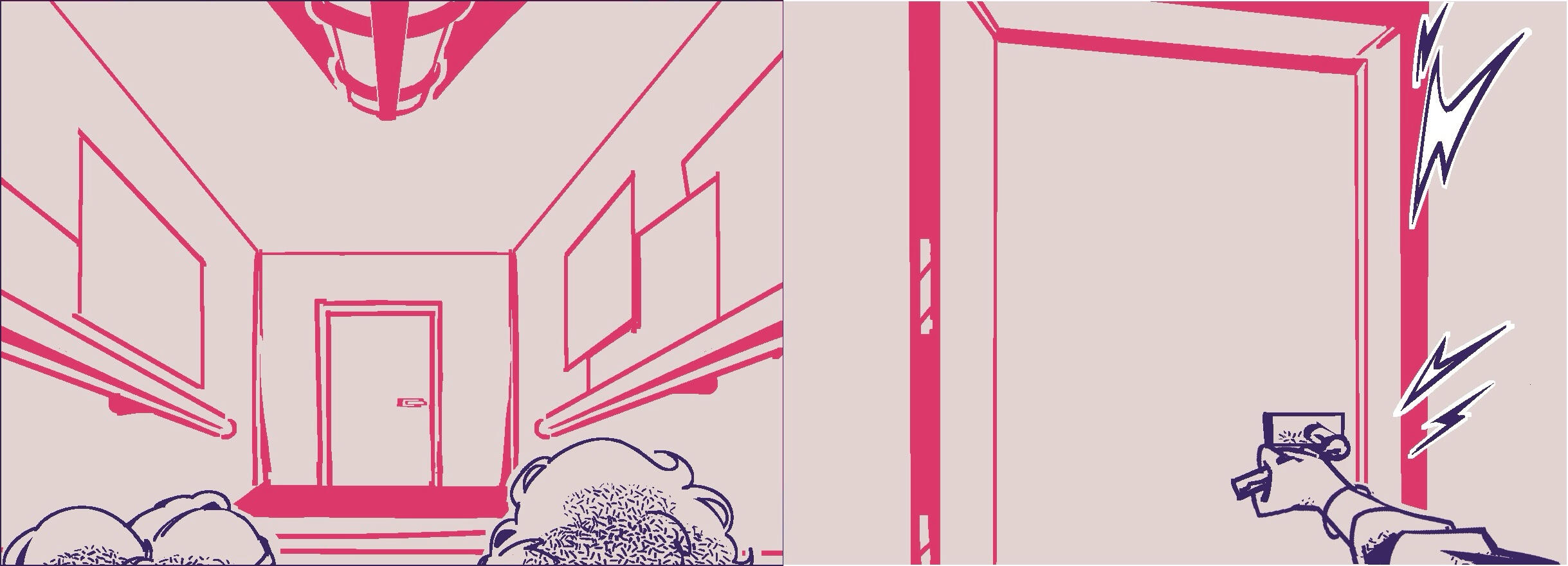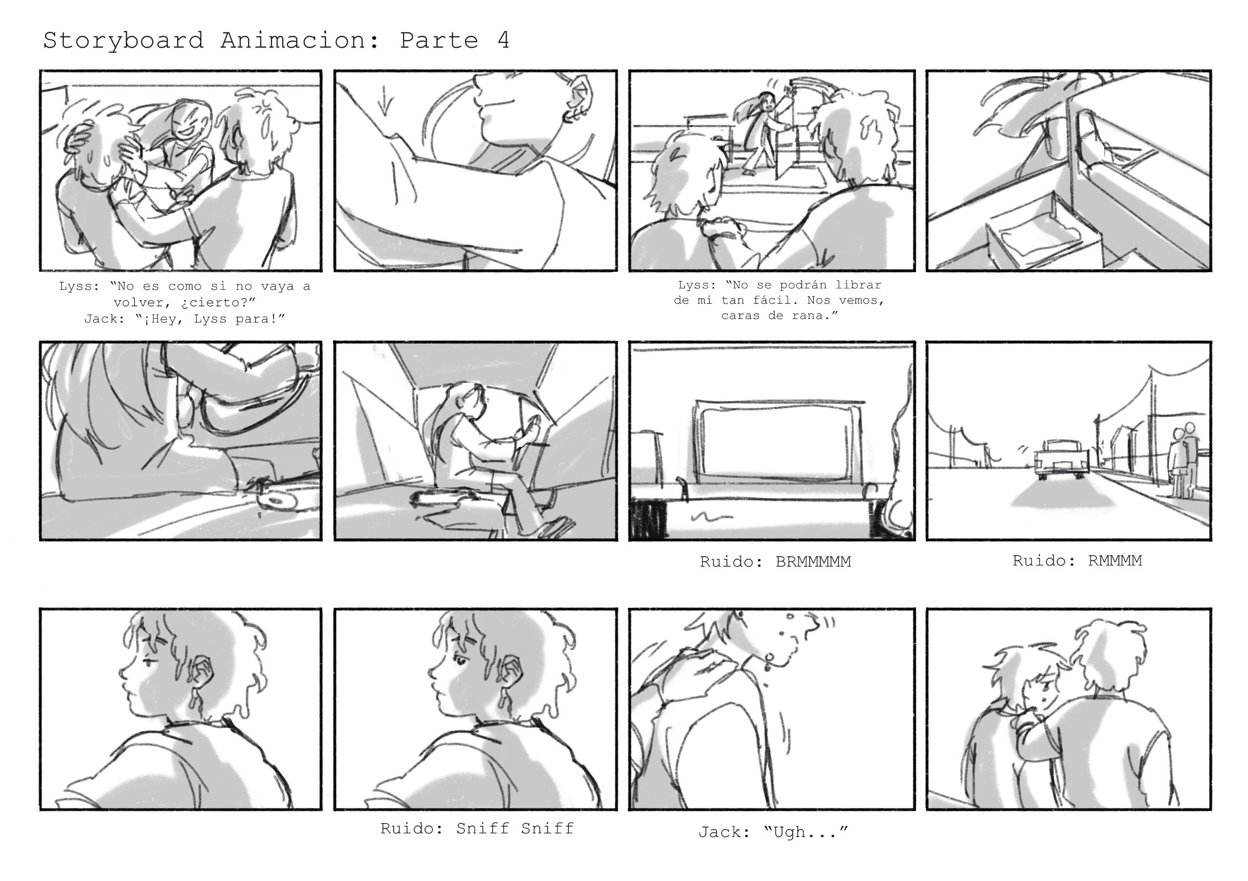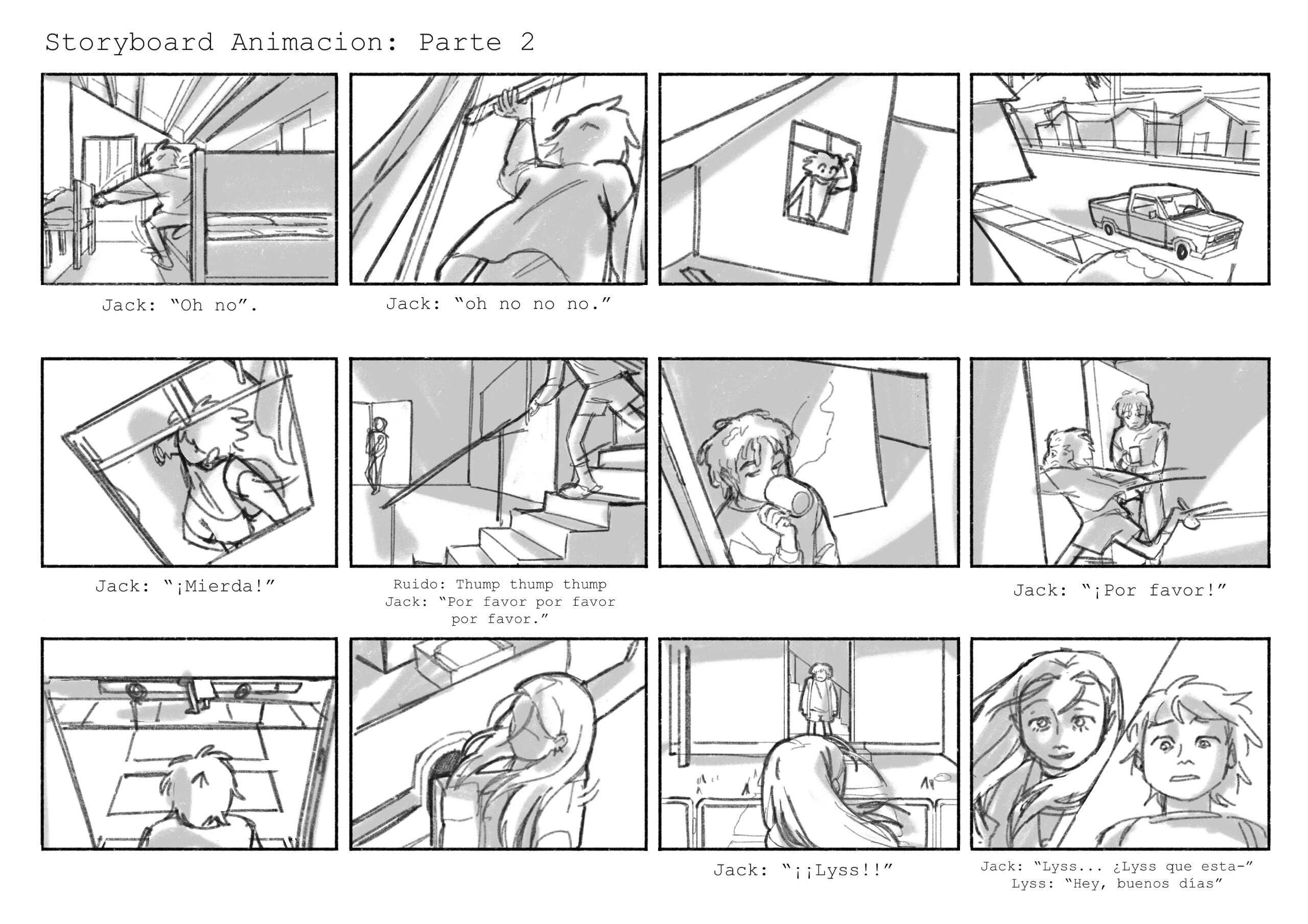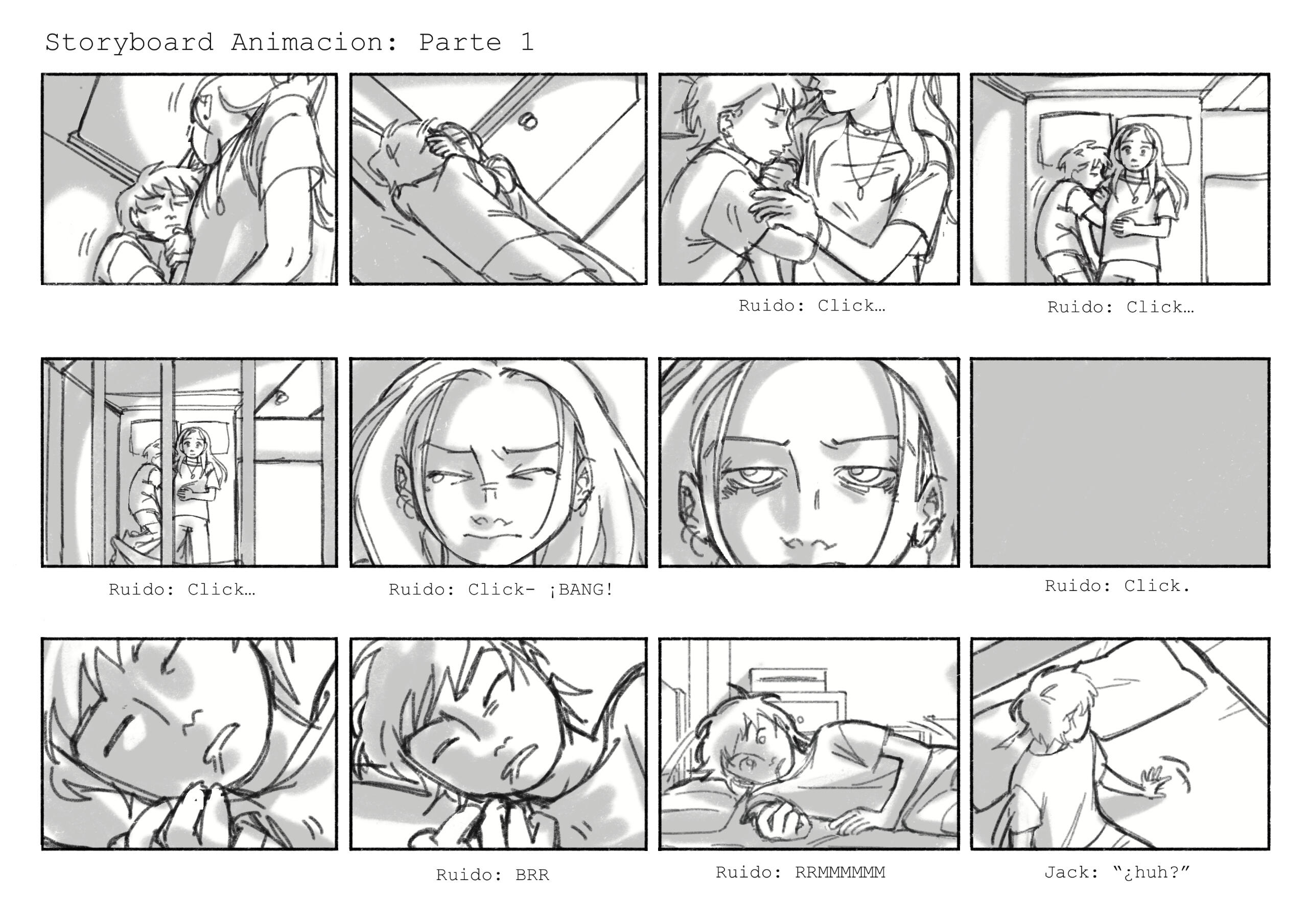 Segunda fase del boceto: cómic de 2 páginas, con un enfoque en encuadre de cámara y montaje de viñetas. Boceto digital. Primera fase del boceto, cómic de 2 páginas, con un enfoque en fondos y perspectiva. Boceto análogo y editado digitalmente. (2024)