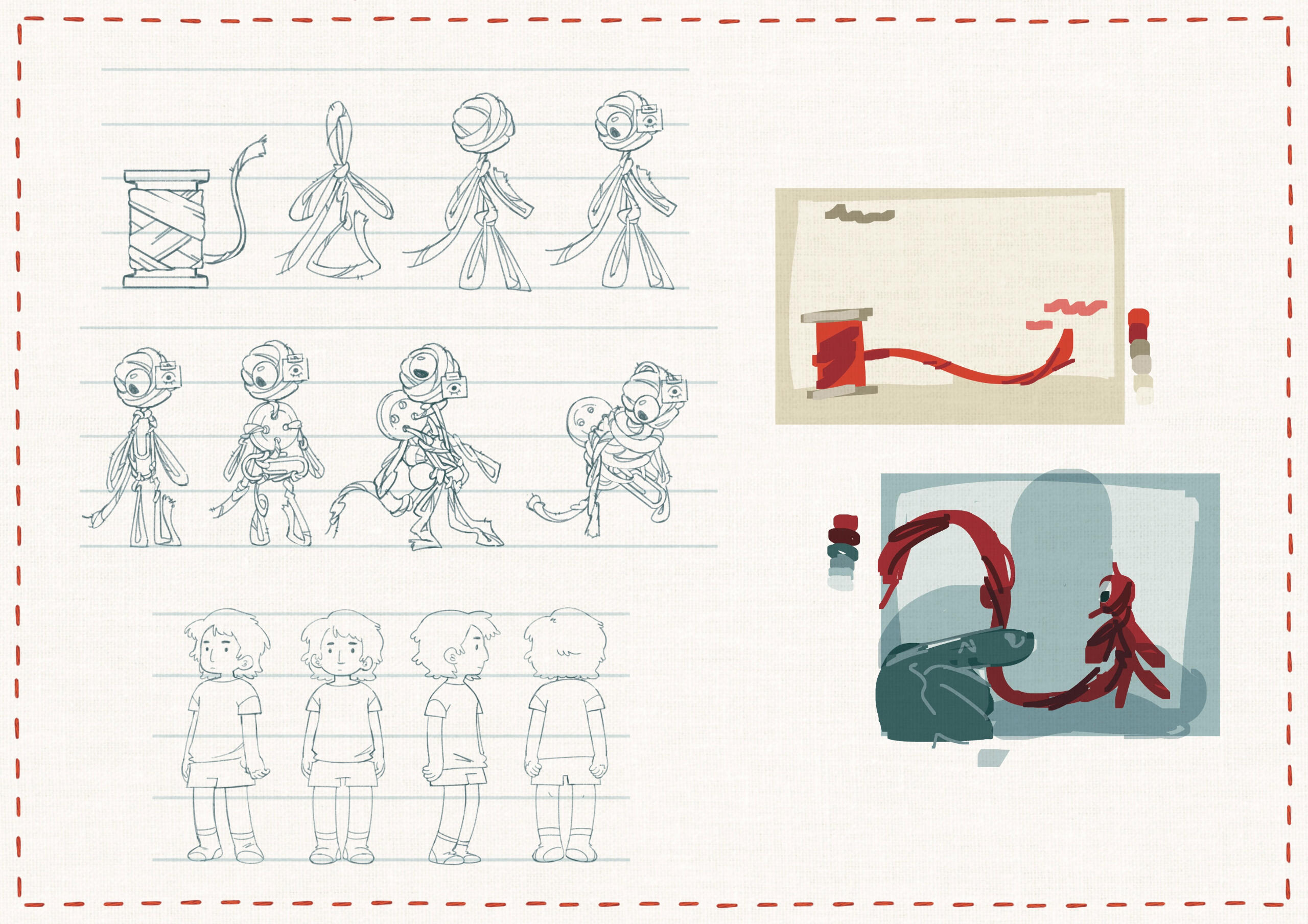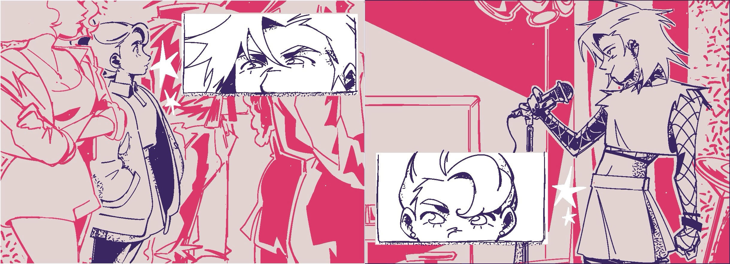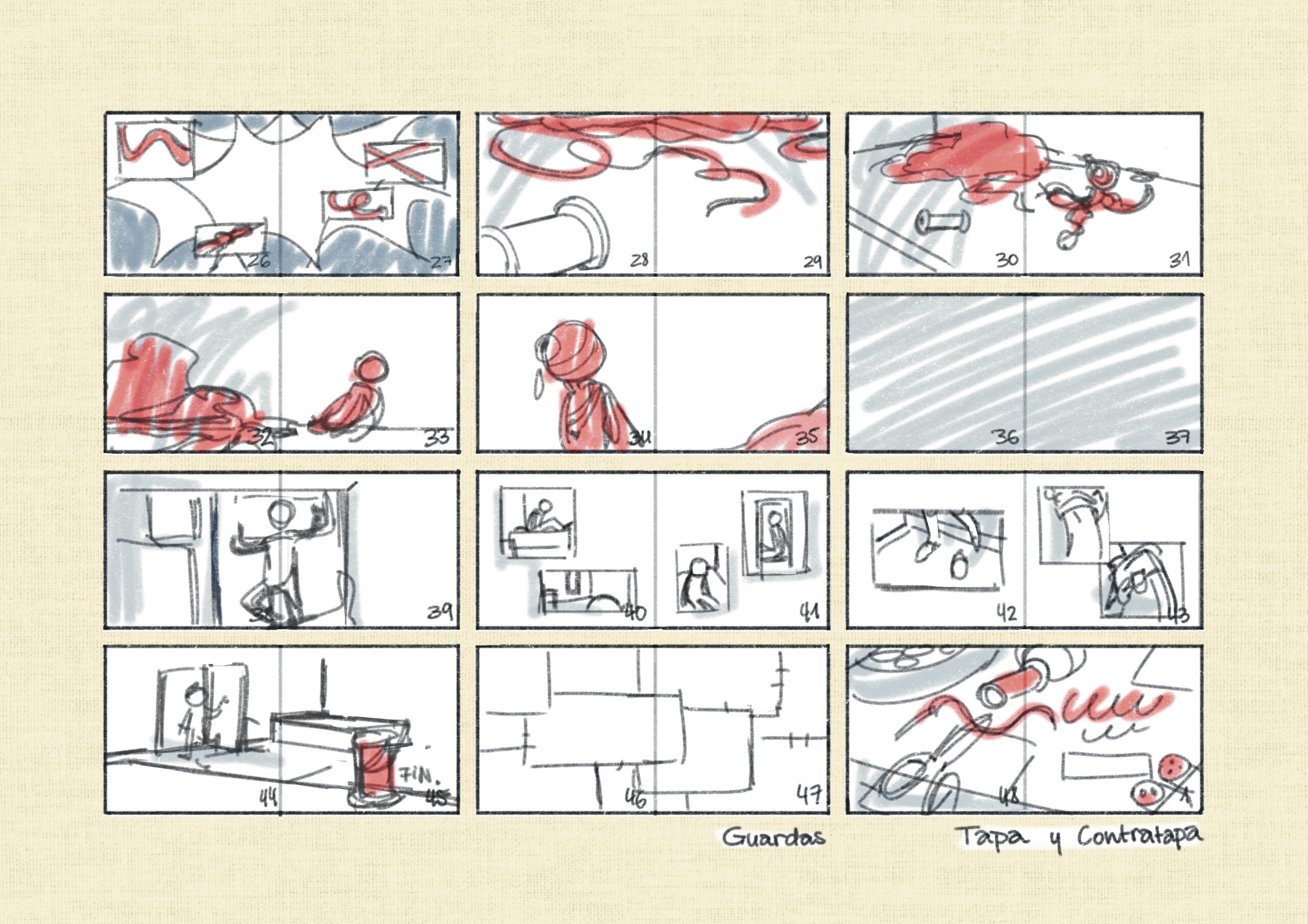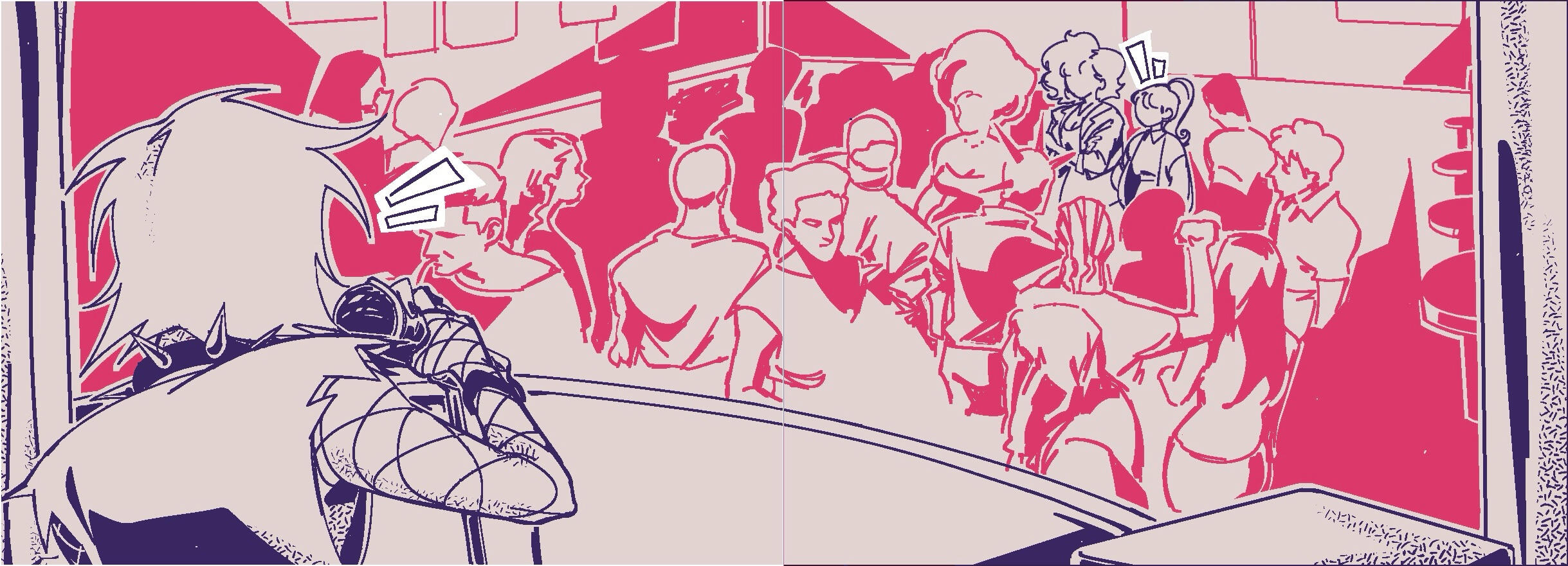 Segunda fase del boceto: cómic de 2 páginas, con un enfoque en encuadre de cámara y montaje de viñetas. Boceto digital. Primera fase del boceto, cómic de 2 páginas, con un enfoque en fondos y perspectiva. Boceto análogo y editado digitalmente. (2024)
